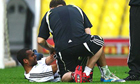 Those were accepted, albeit grudgingly at first, though the full-back was unable to complete the training session and left early, still shaking his head, with the masseur Bill McCulloch for treatment on the swollen right ankle in the dressing rooms.