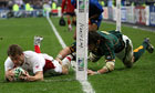 England 3- 17 South Africa (Pienaar try, Pienaar conversion) Oh dear, oh dear. This is going to get very ugly. Just as he did against the Pacific Islanders, Cipriani dwells way too long before kicking away from just inside his own 40-yard line, and Pienaar charges it down, before recovering the loose ball and strolling in for another try, before converting it himself.