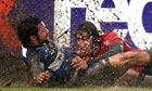 Stevens might just take the view that watching this game on television was no great sacrifice, as he awaits a two-year ban following his personal calamity. By any standards it was a foul day for playing and watching rugby, among the worst in the history of European competition. A storm of freezing hailstones swept across the city shortly before kick-off, forcing the inhabitants of the open temporary stand to seek cover and making the pitch resemble a sponge sprinkled with icing sugar. Then the real downpour started, reducing the playing surface to a mixture of swamp and skidpan. Weekend gales across Europe had already done Stade no favours; the roof of their coach Guy Novès' house was damaged and his team's flight to England on Saturday was delayed for eight hours.