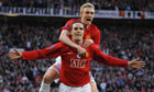 ... and then Darren Fletcher jumped on his back to help him celebrate ... Photograph: Tom Jenkins