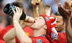 40 mins: Cattermole sticks in a trademark chop on Carrick. Freekick to United, 27.78 yards from goal or thereabouts, a little to the left. Ronaldo smasks int into the wall. Again. He is roundly lampooned by thousands of Wiganites. Again. And now, introducing Alan Bossman, the fastest Googler in the west. "The answer the Jonathan Wilson's question is: Nicky Summerbee (Mike Summerbee) and Marton Fulop (Ferenc Fulop, who scored two for the Germans)".