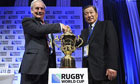 English RFU and IRB Council member Martyn Thomas (L) and vice president and chairman of the Japanese RFU Noboru Mashimo with the Rugby World Cup trophy. Photograph: Action Images Photograph: Action Images