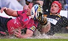 Wasps led for much of the opening half, which was played on a treacherously wet surface. Heavy rain started pouring an hour before the kick-off and the conditions were worse than when Wasps refused to play at Sale last December on the grounds that there was a risk of a player drowning: they could have sunk without trace today but the Blues did not opt to retreat to their coach and tuck into pizza.
