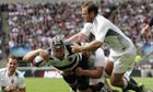 Further tries from Visser, Smith and Van Niekerk followed, cancelling out England's early gains. Narraway's good approach work put a club-mate, Henry Trinder, over in the right corner, Monye stole a try under the nose of a casual Nicolas Jeanjean and Simpson‑Daniel revived memories of days past as he swerved past Baby. The Baa-Baas, though, possessed too experienced a pack to be splintered and Carl Fearns' yellow card for killing the ball helped their cause.