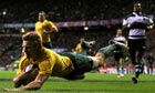 In the second quarter, Australia started to string together some threatening passages, and theirs were the two tries of the first half, Digby Ioane slashing through a huge gap in midfield for the first, before Lachie Turner was worked over in the corner for the second with the last play of the half.