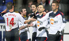 Martin Petrov celebrates with his Bolton team-mates after he scored their second goal. Photograph: Carl Recine/Action Images Photograph: Carl Recine/Action Images