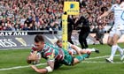 Thompstone clinched his hat-trick later, gathering Smith's clever chip to race home. That was as many tries as they could score, though, which is some tribute to Exeter, who claimed the mild consolation of a try at Welford Road, when Ben White drove over at the death, which, again, required TMO approval.
