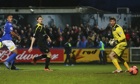 Macclesfield Town's Steve Williams, left, scores against Sheffield Wednesday in the FA Cup third round match at Moss Rose. Photograph: Dave Thompson/PA Photograph: Dave Thompson/PA