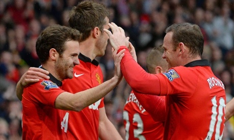 76 min: This is damage limitation now. Valencia hares down the right and looks for the bottom corner from 20 yards. Ruddy claims at the second attempt. There is a party atmosphere in Old Trafford. "Since we are at Old Trafford, and since I desperately want to record my first MBM hat-trick," writes Marie Meyer, "I offer you: split Chicarito." Neither Rooney nor Mata are getting the match ball, whatever they do now. It's all yours.