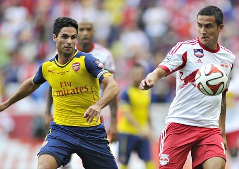 Arsenal's Mikel Arteta, left, competes for the ball against Tim Cahill of the New York Red Bulls. Photograph: Adam Holt/Action Images Photograph: Adam Holt/Action Images