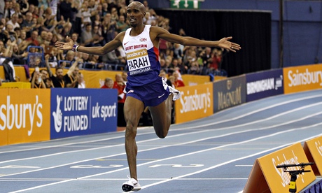 Great Britain’s Mo Farah celebrates as he wins the two-mile race and breaks the world record at the Birmingham Indoor Grand Prix. Photograph: Ian Kington/AFP/Getty Images Photograph: Ian Kington/AFP/Getty Images