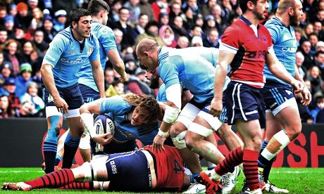 Giovanbattista Venditti followed up a penalty attempt by the decidedly shaky Kelly Haimona. The ball hit the post and the wing caught it brilliantly one-handed almost behind his back. It seemed impossible that he could ground the ball. He held it against the post – too high to count – and then used the upright to bring the ball to the other side where he touched it down for a fleeting moment on the line. It was a remarkable act, but it did not give his team the lead – it merely kept them in contention, trailing a single point.