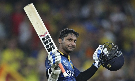 Kumar Sangakkara celebrates scoring a century during Sri Lanka's victory over Scotland at the Cricket World Cup. Photograph: Rob Griffith/AP Photograph: Rob Griffith/AP