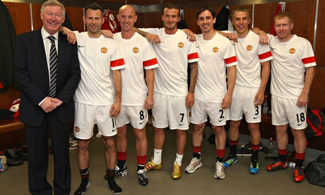 The Class of ‘92 strike a pose with their former team-mate David Beckham and manager Sir Alex Ferguson. Photograph: John Peters/Man Utd via Getty Images Photograph: John Peters/Man Utd via Getty Images