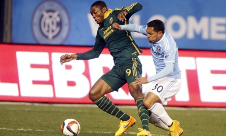 Portland Timbers’ Fanendo Adi battles for possession against New York City FC’s Javier Calle. Photograph: Jason DeCrow/AP