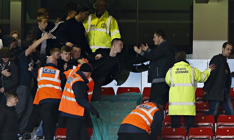 Tuesday evening’s match – won 4-0 by Warren Joyce’s young United side, who now need only a point against City to seal the title – was marred by skirmishes between fans in the stands and a pitch invader late in the game. Manchester police made three arrests.