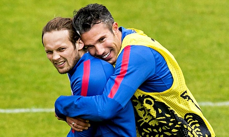 Robin van Persie’s Manchester United future may be uncertain but the striker, right, had a joke with his club-mate Daley Blind during a Holland training session. Photograph: Koen van Weel/EPA Photograph: Koen Van Weel/EPA