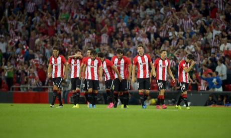 Athletic Bilbao players celebrate Mikel San José’s goal against Barcelona in the Spanish Super Cup. Photograph: Vincent West/Reuters