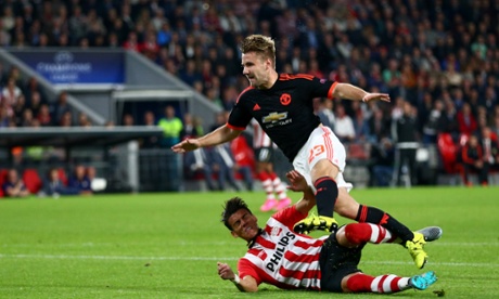 On the pitch PSV were enjoying more of the play in a contest that pinballed between each side’s area. The Dutch champions’ second came when Darmian spooned the ball to Andrés Guardado. The midfielder fed Lestienne down the left and United were about to suffer a sucker-punch as the blond No16’s dipping cross cleared Marcos Rojo, who replaced Shaw, and Luciano Narsingh headed past De Gea.