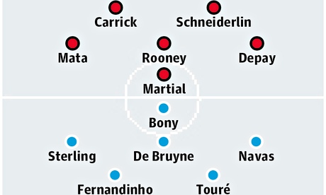 The all-time goal tally in the 169 previous derbies stands at 249-234 to United with City winning 49 times to their rivals’ 70. If Manuel Pellegrini can earn a 50th victory for City their lead over United will stretch to five points and a significant psychological blow will have been dealt. But with David Silva and Sergio Agüero out and Louis van Gaal’s side playing at home, United are surely favourites despite the manager’s protestations to the contrary. Jamie Jackson
